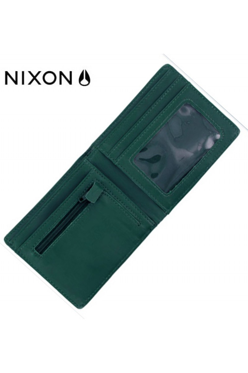 Itin kompaktiška tamsiai žalios spalvos  piniginė su firminiu "Nixon" ženklu. 3 skyreliai kortelėms, 2  atskiri skyreliai dokumentams, 1 vidinis skyrius popierinėms kupiūroms,  1 permatomas skyrelis nuotraukai ar dokumentui, 1 užsegamas skyrelis monetoms.