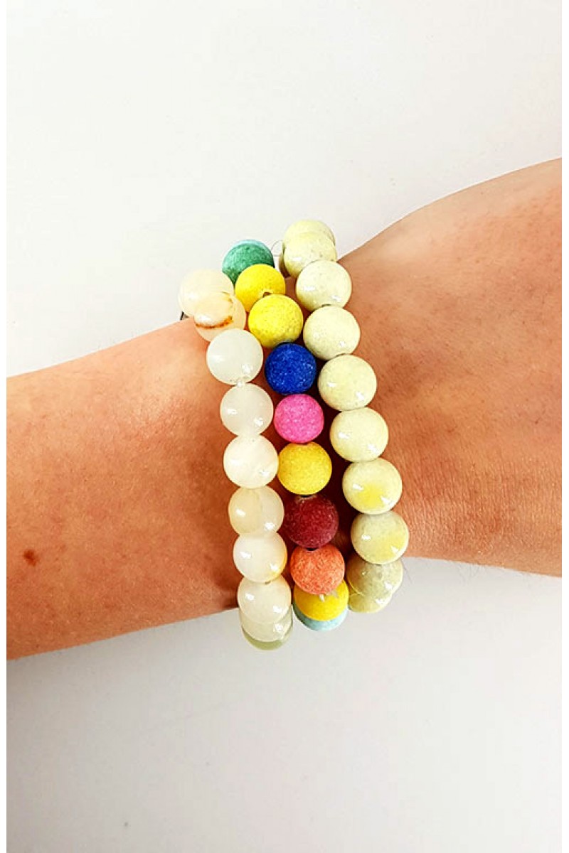 Karoliukų dydis - 8 mm. Apyrankės yra vieno dydžio, sunertos ant 2 sluoksnių gumyčių, todėl puikiai nešiojasi, patogiai užsideda ir nusiima.