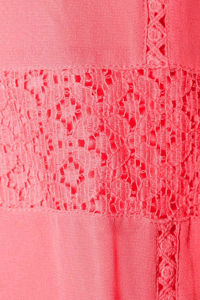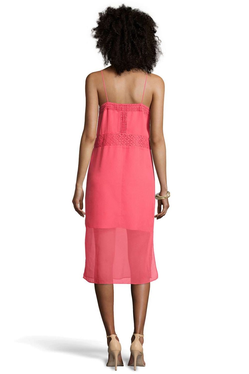 Žavinga koralinės spalvos vidutinio ilgio šifoninė unikalaus dizano Natalia suknelė ant petnešėlių iš Boutique kolekcijos.